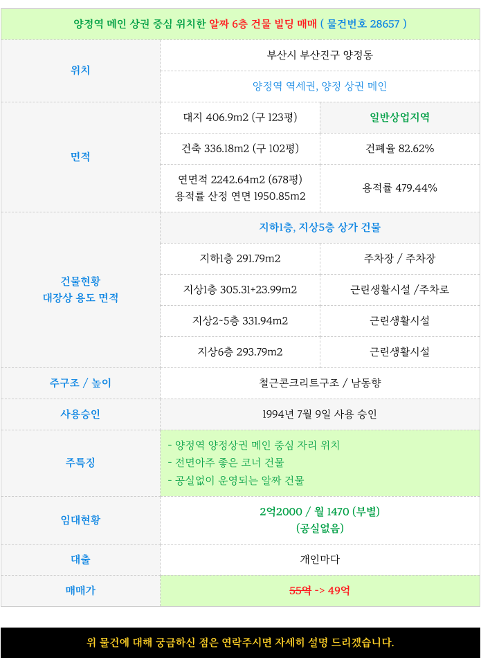 양정역 메인 상권 중심에 위치한 알짜 5층 꼬마 건물 빌딩 매물 제원 정리해 드리겠습니다.