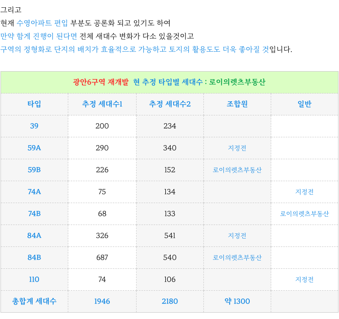 4. 광안6구역 재개발 : 계획된 각 타입별 세대수 :