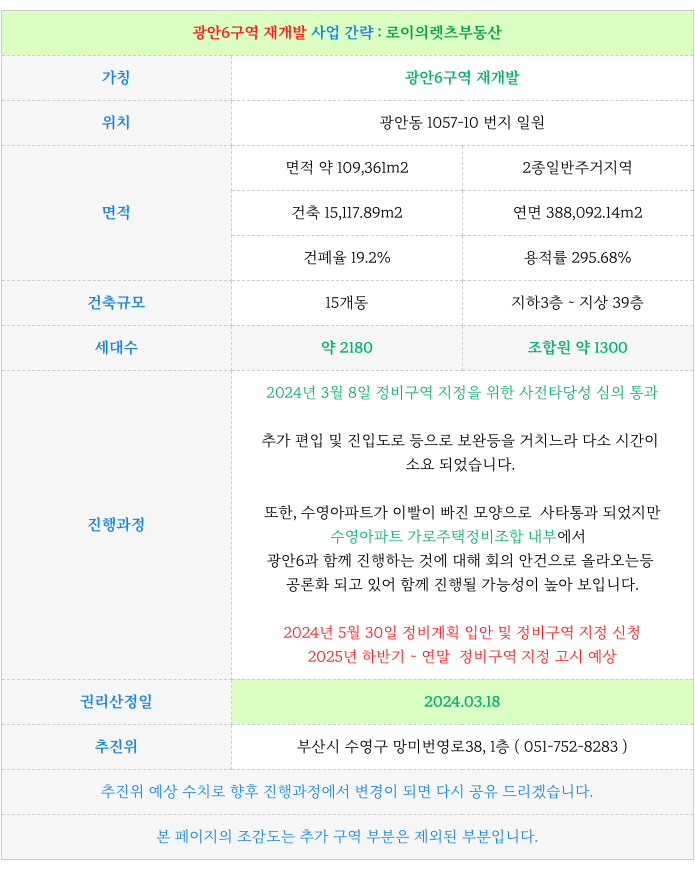 광안6구역 재개발 : 현재까지 진행 사항 & 예상 일정 체크 : 등 추가 정보는 아래 페이지를 참고 부탁드립니다.