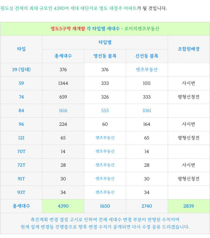 4. 영도5구역 재개발 : 현 계획 타입별 세대수 :