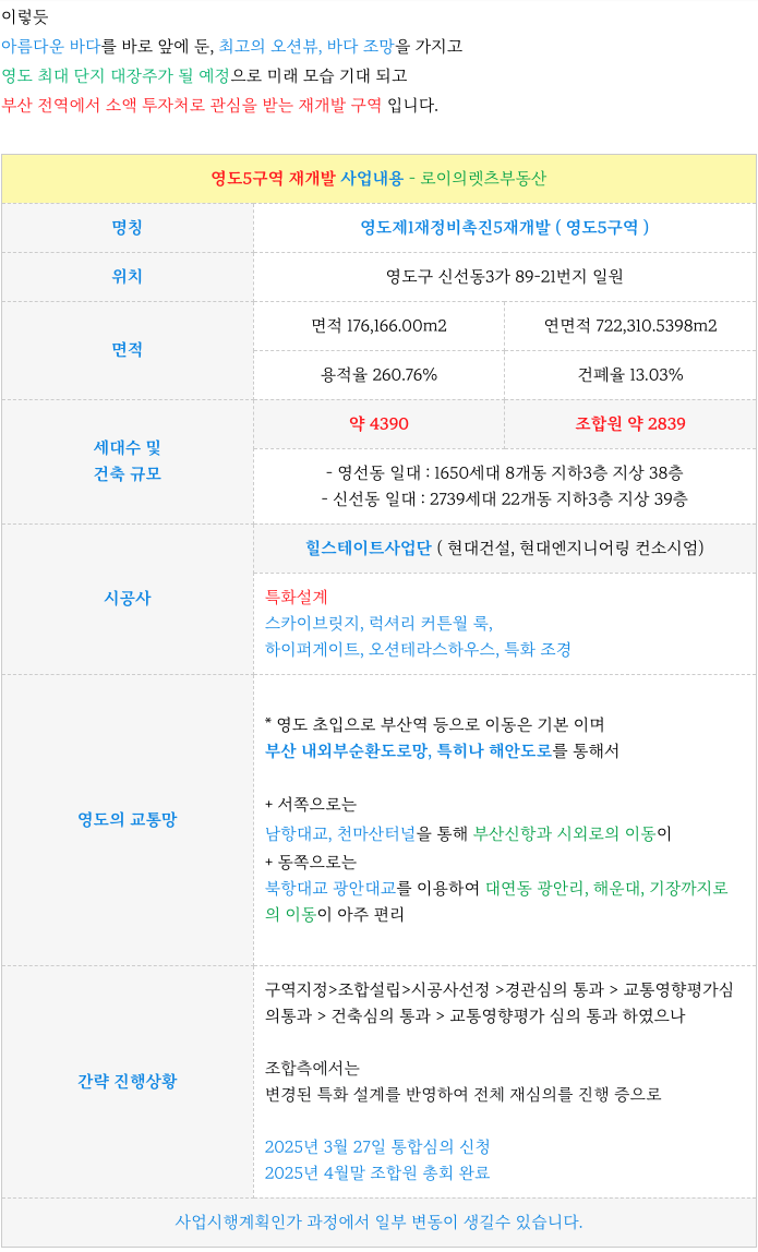 영도5구역 재개발 : 재개발 사업 진행 사항 + 이후 절차 : 등 추가 정보는 아래 페이지를 참고 부탁드립니다.