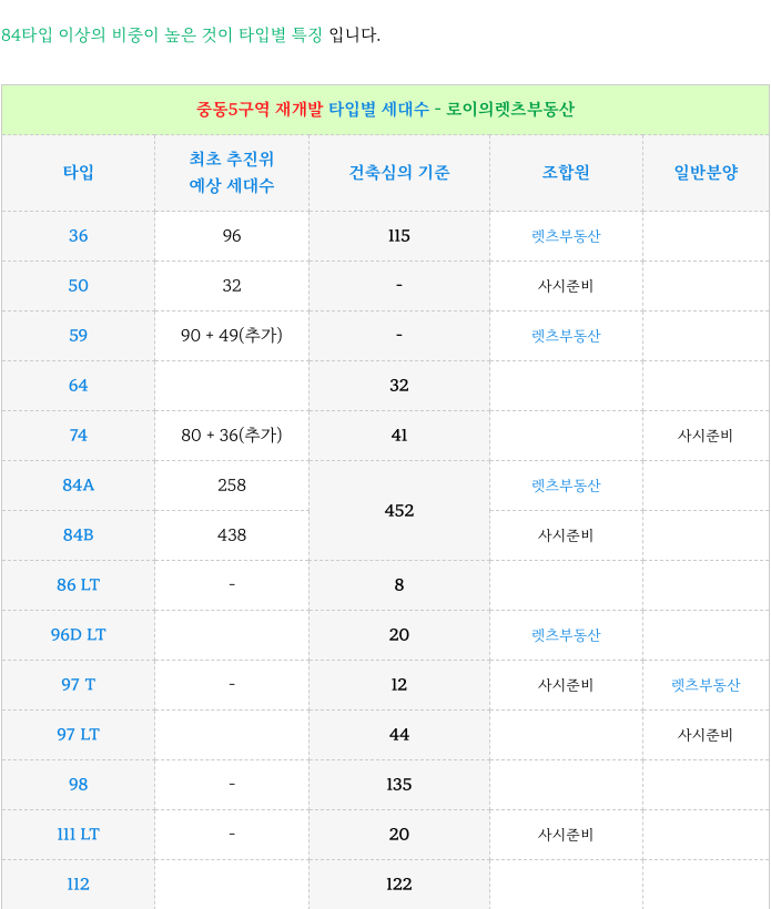 5. 계획된 각 타입별 세대수 : 중동5구역 재개발 :