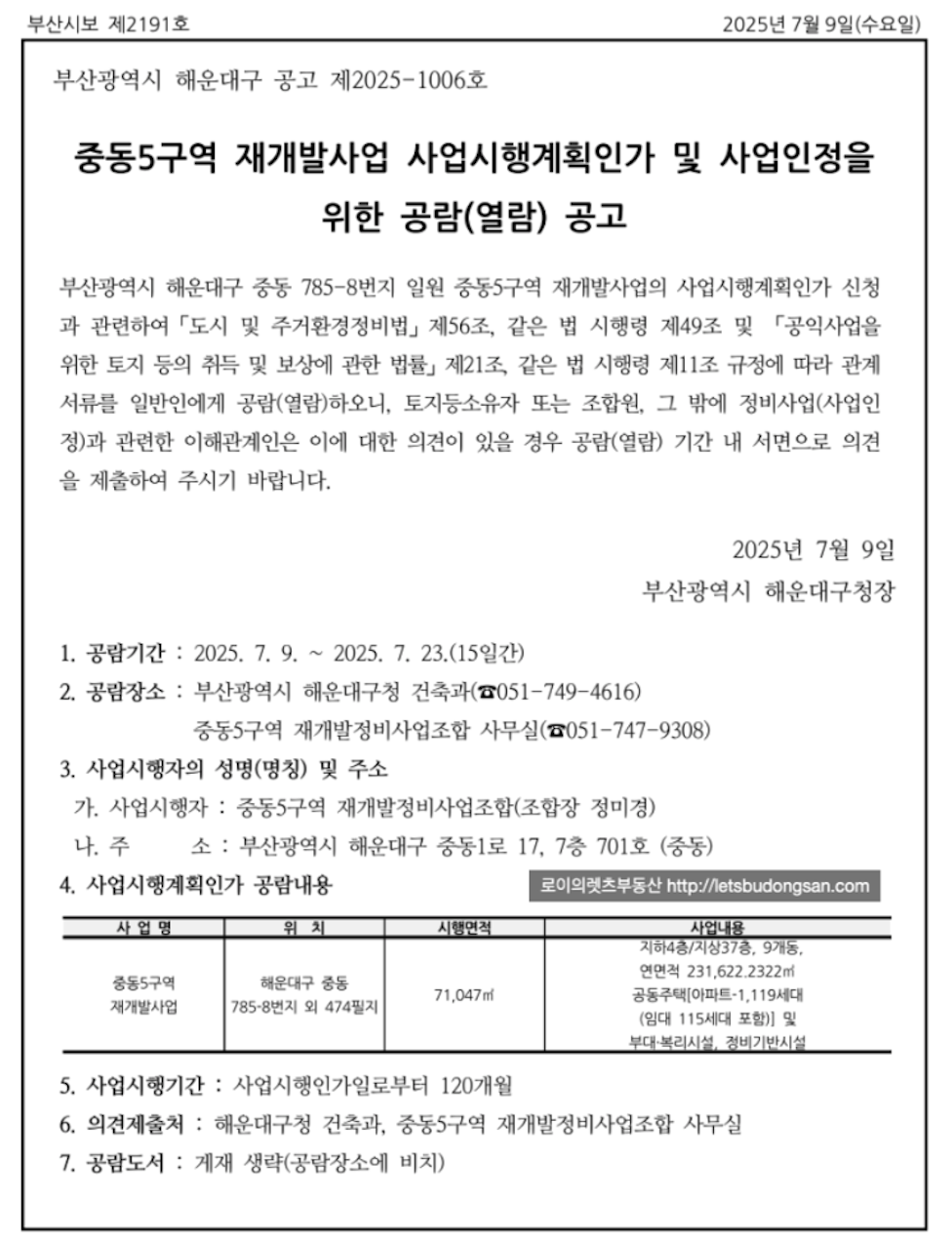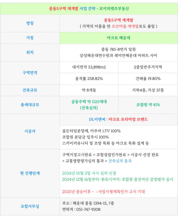 해운대 중동5구역 재개발 : 최저 급, 매 매물 & 사시 임박 소식
