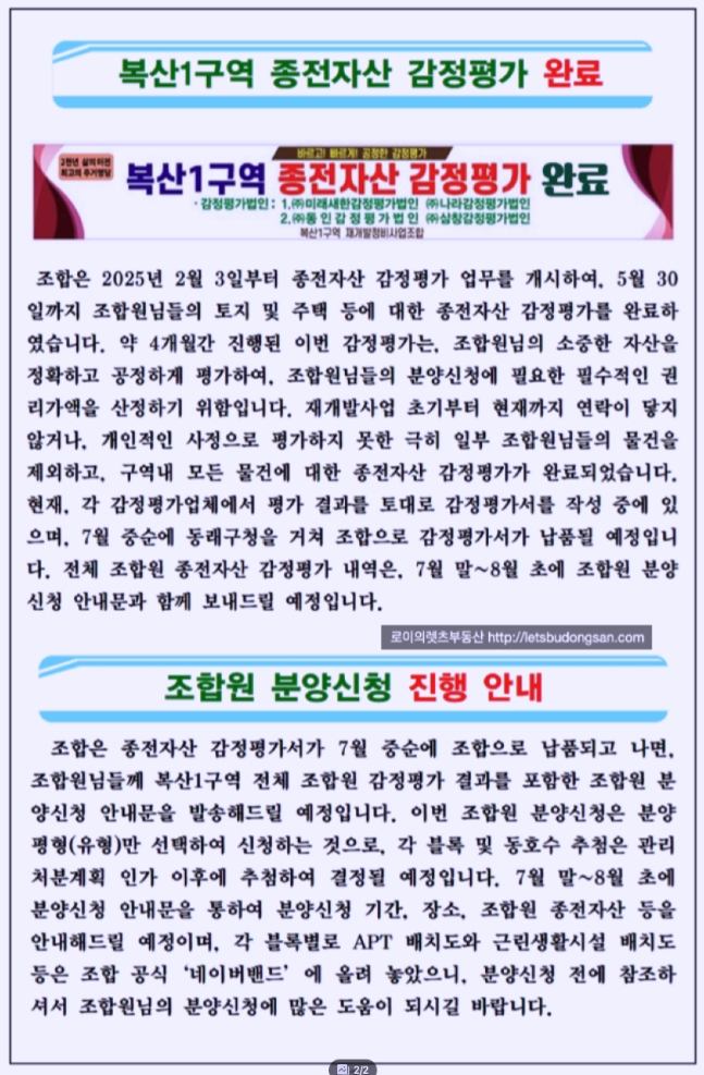 - 2025년 7월말 ~ 8월초 : 조합원 종전자산 감정평가 개별 통지 및 분양 신청 시작 예정