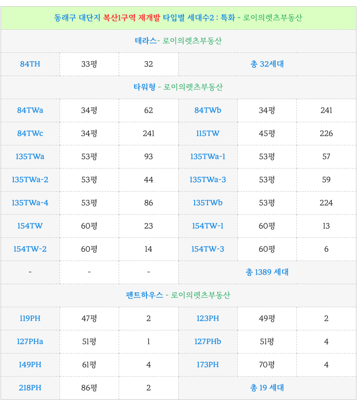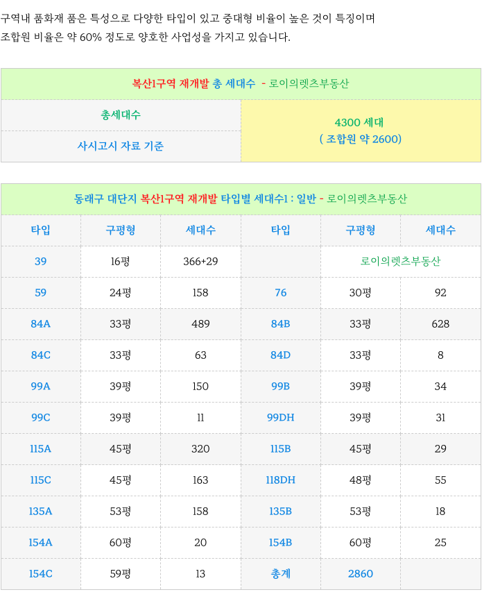 7. 복산1구역 재개발 : 계획된 각 타입별 세대수 : 재개발 :