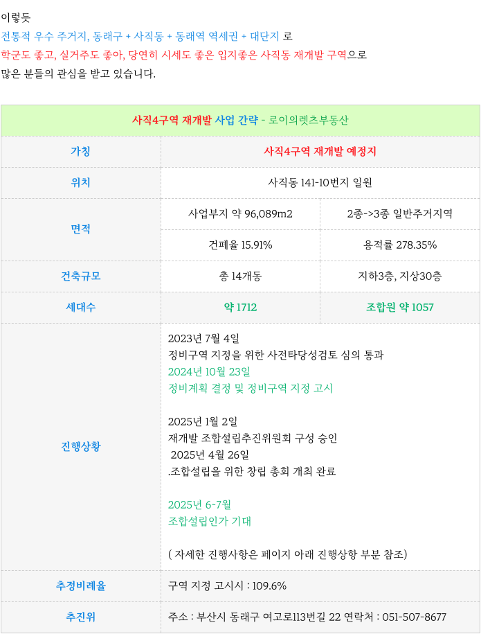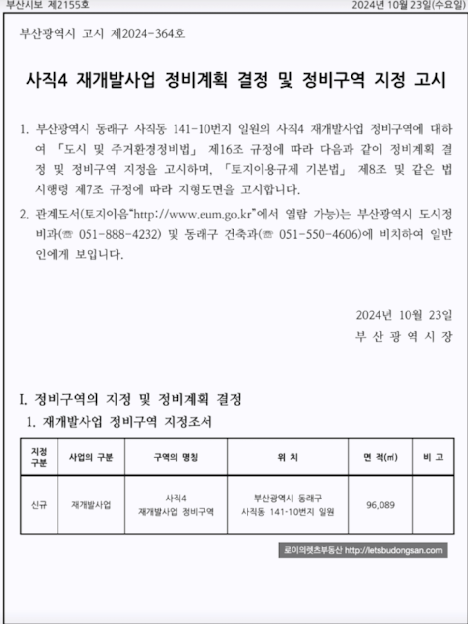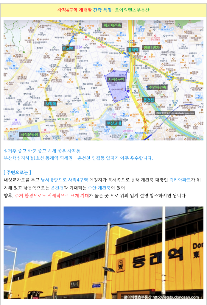 안녕하세요 로이의렛츠부동산 ( JAK 제이에이케이 부산 ) 입니다. 오늘은 입지좋은 사직4구역 재개발 : ...