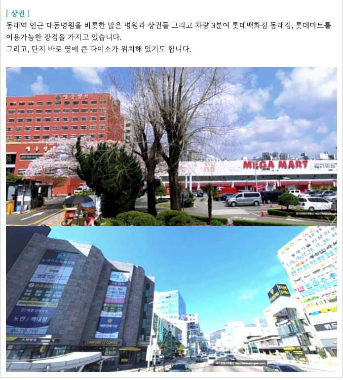 대형마트 메가마트가 도보 거리에 있고, 차량 3분이며 롯데백회점 동래점의 이용도 좋으며