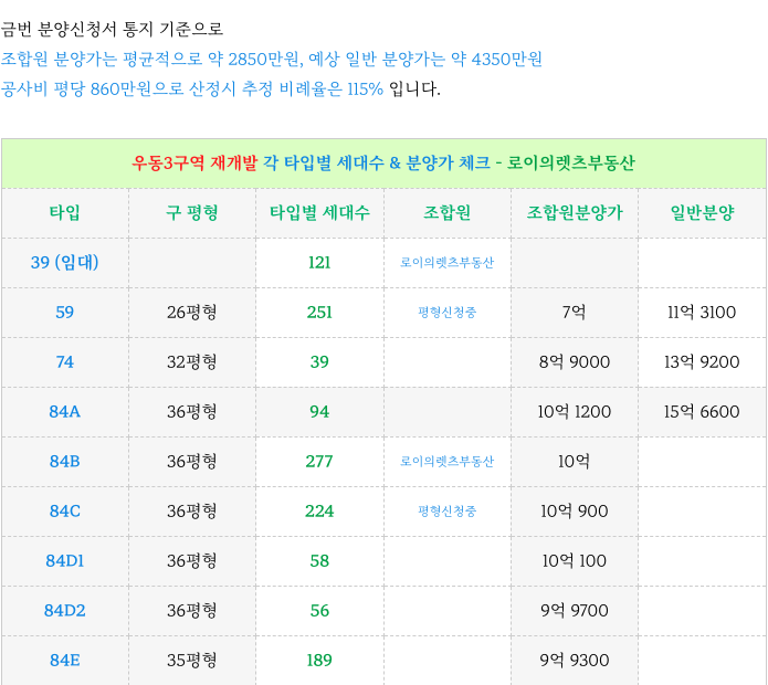 4. 타입별 세대수, 분양가 체크 : 우동3구역 재개발 :