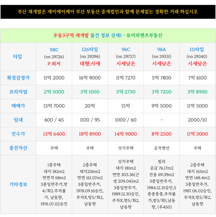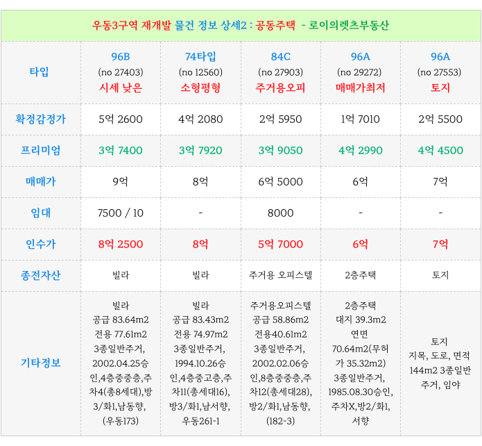 2. 우동3구역 재개발 : 타입 + 확정감정가 반영 매물 소개 :