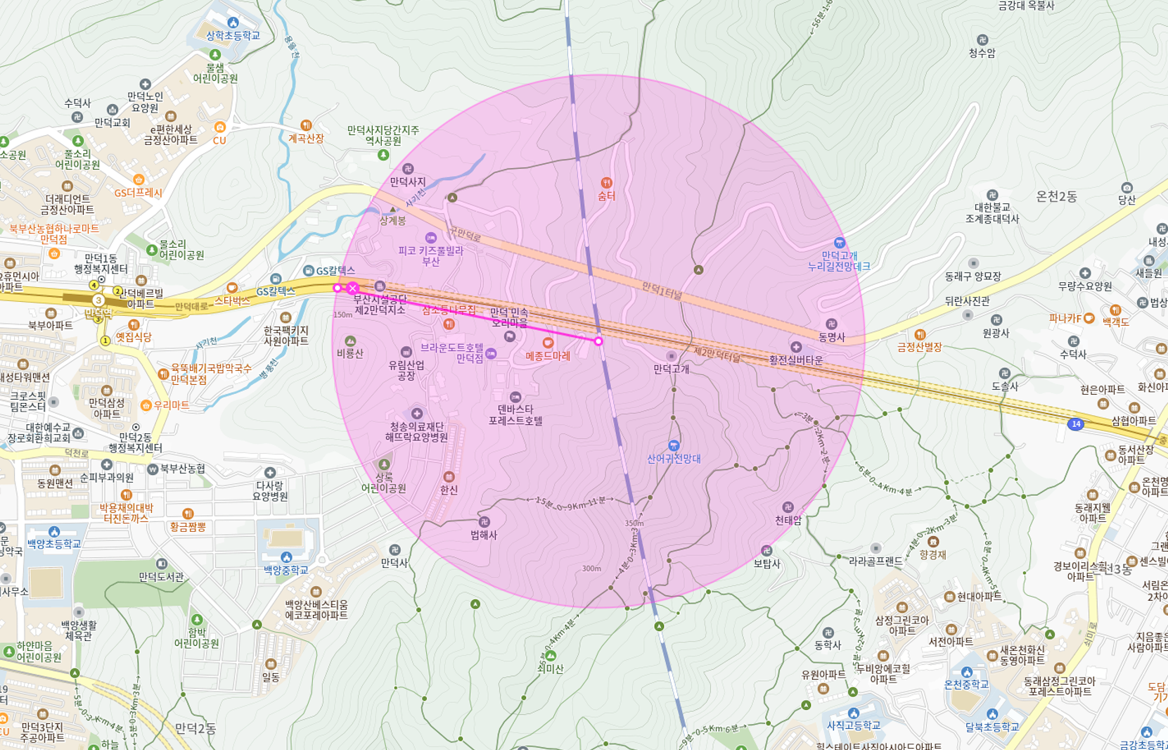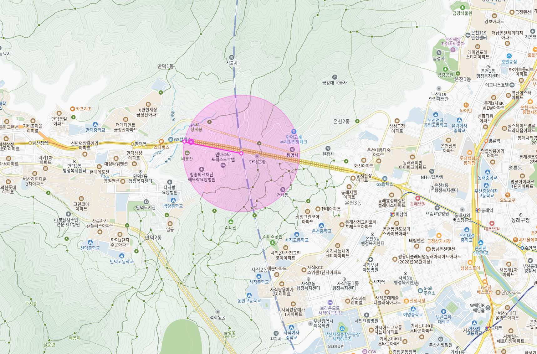 - 경치 좋고 공기 좋은 만덕1터널 옆 가든 음식점 및 호텔 밀집 지역