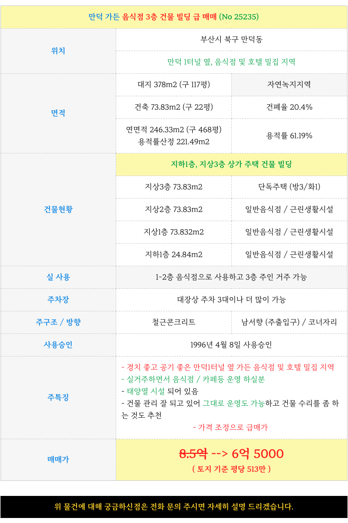 오늘 만덕 가든 음식점 3층 건물 빌딩 급 매매 상세 제원 소개해 드립니다. (No 25325)