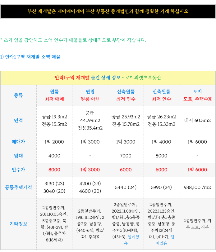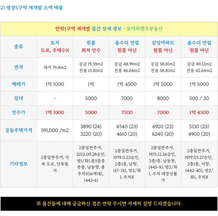 1. 현재 가능한 매물 소개 : 명장5구역, 안락1구역 재개발 :