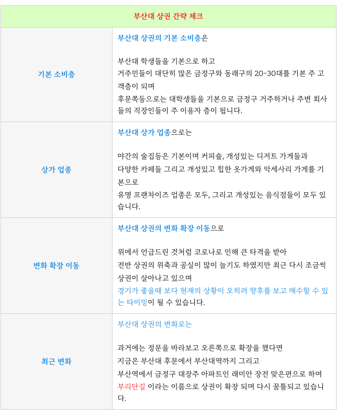 기본적으로 부산대생을 비롯한 금정구 동래구의 많은 유동 고객들을 가지고 있는 우수 상권권으로