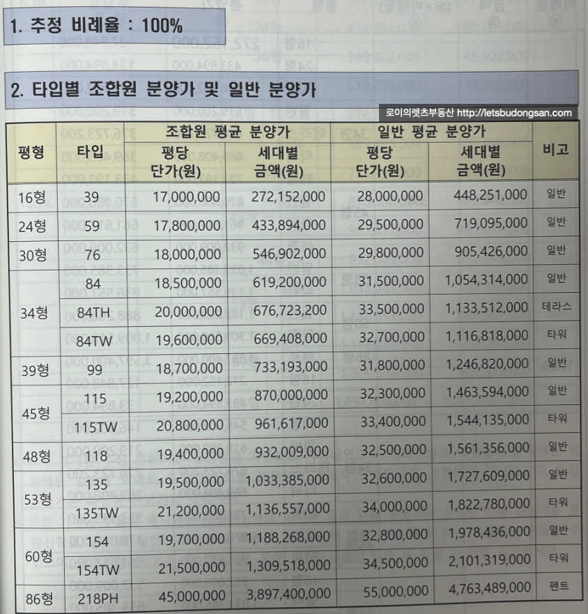 + 조합원 분양가 84타입 기준 평당 1850, 6억 1920