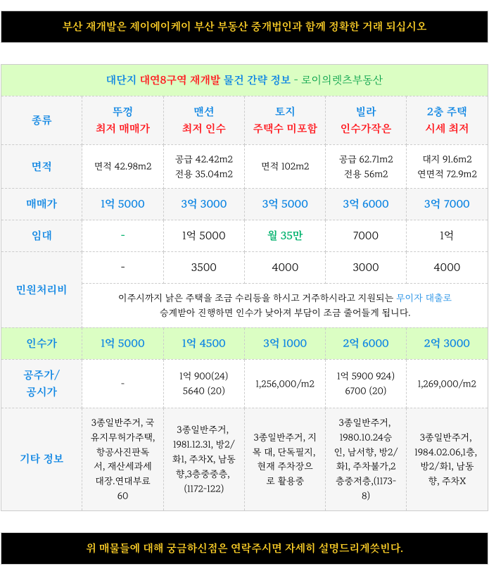 부산 전역 재개발에 대해 궁금하신 사항은 방문 또는 연락주시면 자세히 설명 드리겠습니다.
