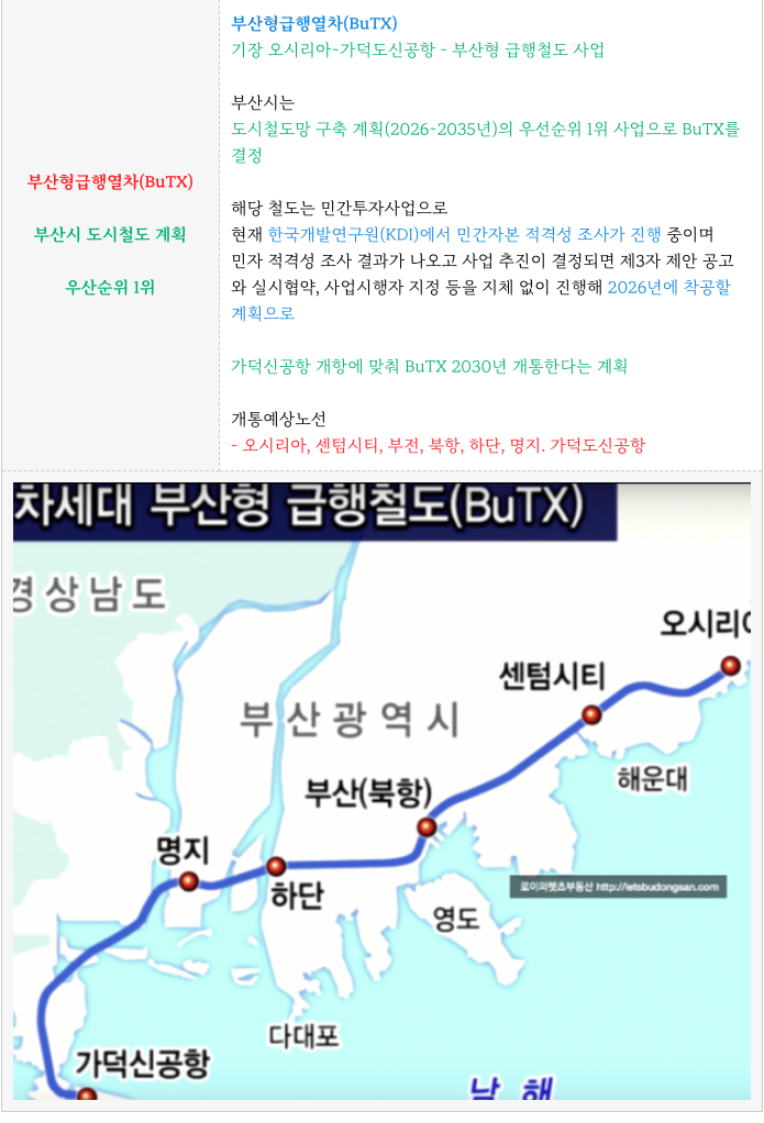 라) 부산형급행열차 (2030목표) : 오시리아~하단-가덕신공항 연결 대심도 열차로 부산시에서 적극 추진중