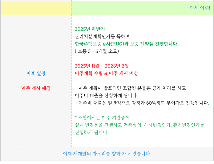 빠르면 11월 또는 2026년 연초에 이주가 시작 될 것으로 기대 됩니다.