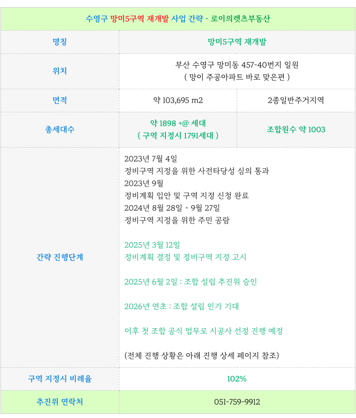 1. 재개발 사업 간략 요점 : 망미5구역 재개발 :