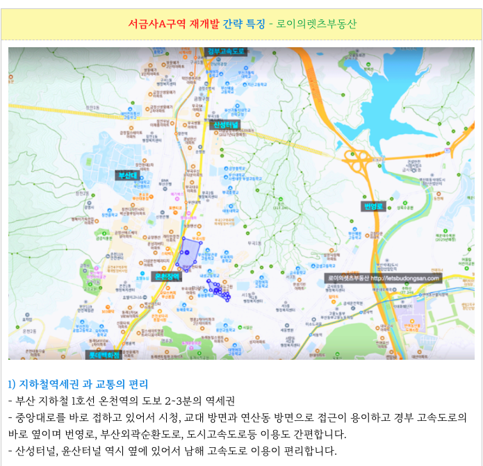 교통 편리 : 경부고속도로, 번영로, 부산외곽순환도로, 도시고속도로, 산성터널, 윤산터널 :