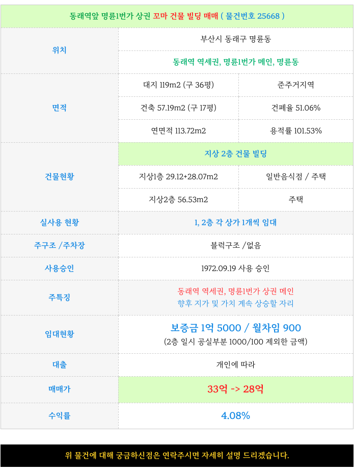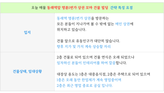 동래역 앞 명룬1번가 상권 2층 꼬마 건물 빌딩 매매 물건 제원 소개 드립니다.