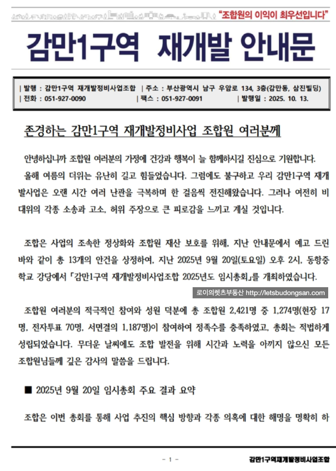 감만1구역 재개발 : 최.저.소.액 매물 & 9월 총회 + 10월 조합 소식지 내용 소개해 드리겠습니다.