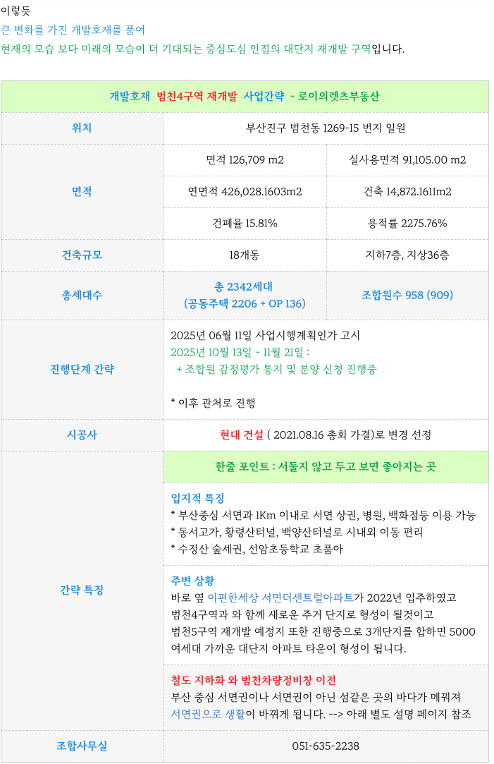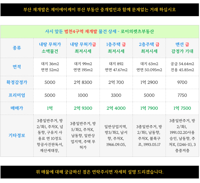 부산 전역 재개발에 대해 궁금하신 사항은 방문 또는 연락주시면 자세히 설명 드리겠습니다.