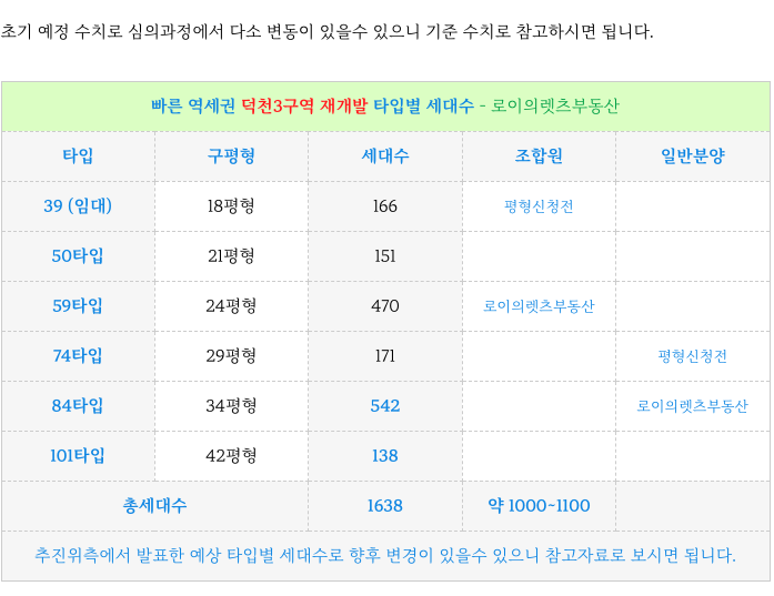 3. 덕천3구역 재개발 : 예상 타입별 세대수 :