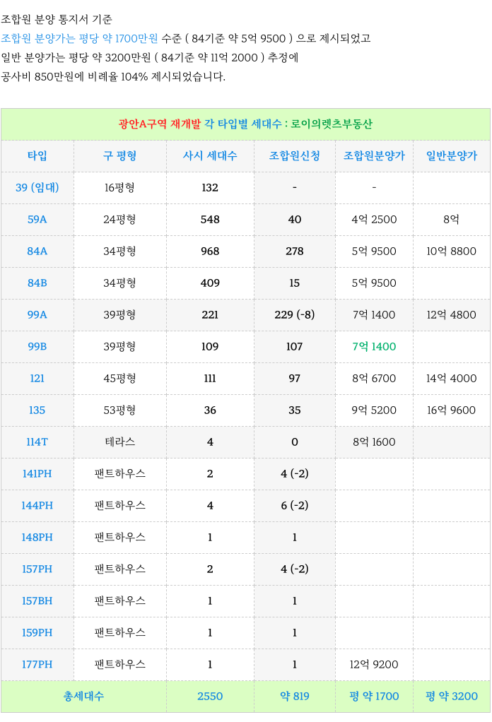 3. 타입별 세대수 + 분양가 : 광안A구역 재개발 :