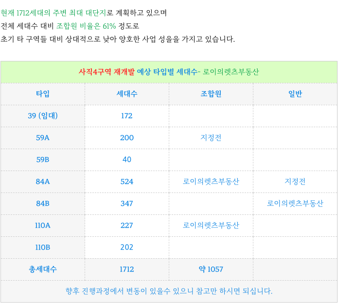 3. 사직4구역 재개발 : 얘상 타입별 세대수 :