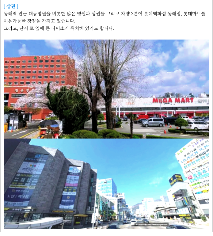 동래역 주위로 대동병원등 많은 병원과 대형마트 메가마트등 여러 상가들이 밀집해 있고