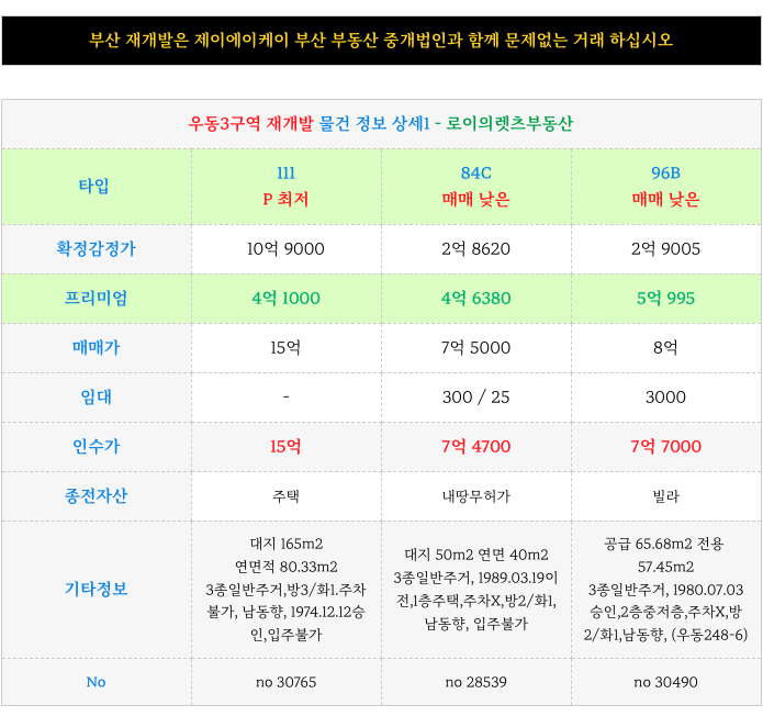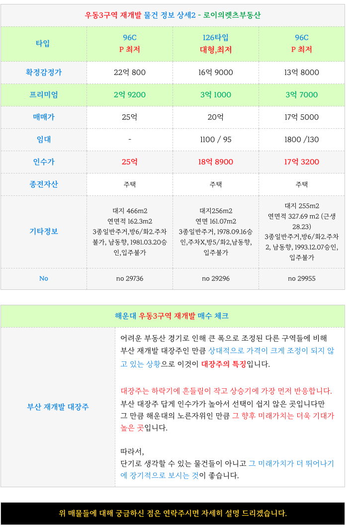 1. 현재 가능한 매물 소개 : 우동3구역 재개발 :