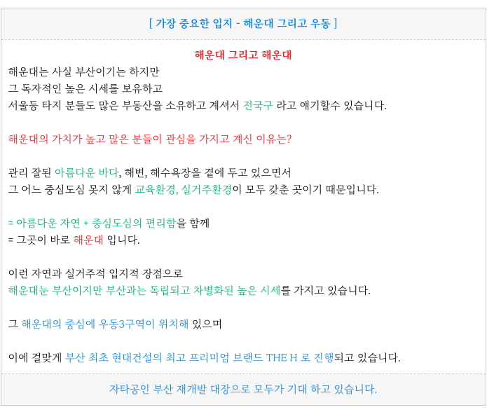 부산의 특별한 해운대, 그 중심 우동에 위치하여