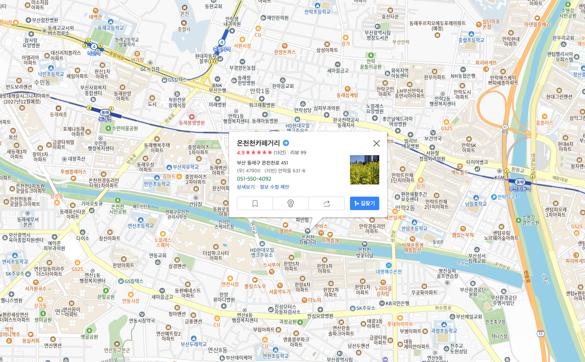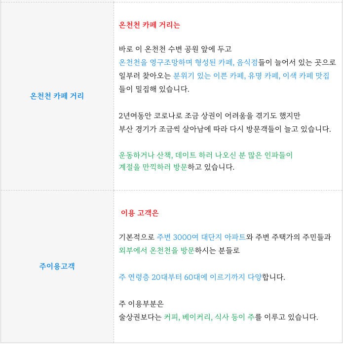 - 온천천 수변 공원을 품고 있어 평상시에도 많은 유동 인구가 많음