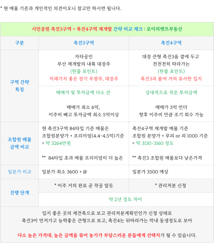 핫하고 인기 있는 촉진3과 오늘 설명 드리는 촉진4구역 간략 비교하였습니다.