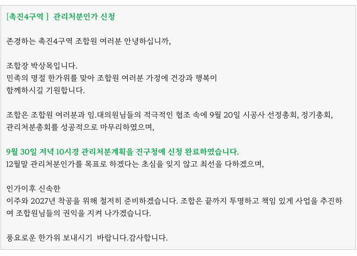 2025년 9월 30일 드디어 조합에서는 관리처분계획인가를 신청하였습니다.