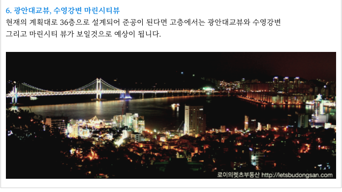 향후 단지가 들어서면 고층에서는 광안대교 조망과 수영강변 조망을 기대해 볼수 있습니다.