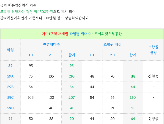 4. 가야1구역 재개발 : 변경 타입별 세대수 + 분양가 체크 :