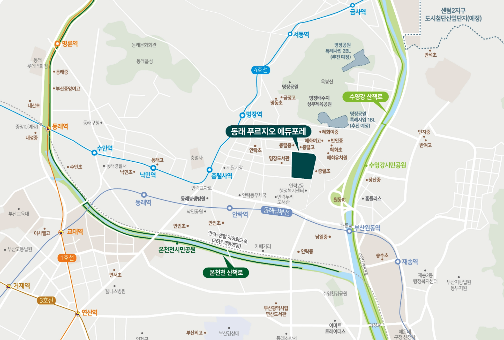 또한, 재래시장 서원시장과 명장시장이 도보 거리에 있고 동래시장은 불과 5분여 거리내 있어