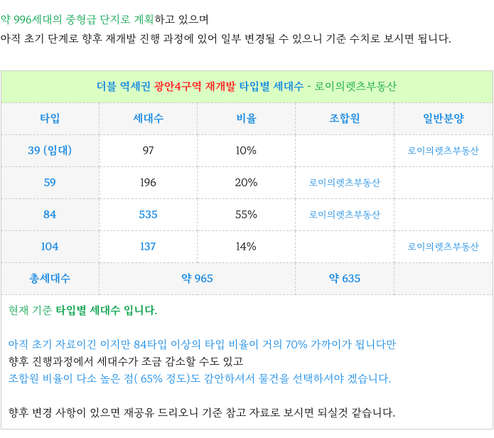 4. 광안4구역 재개발 : 타입별 세대수 :