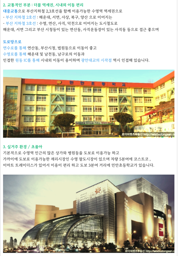 - 수영역 더블 역세권 : 부산 지하철 2호선, 3호선 환승센터.