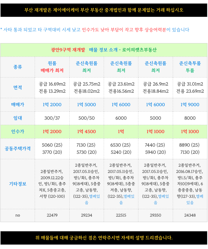 2. 광안9구역 재개발 : 현 소액 매물 소개 :