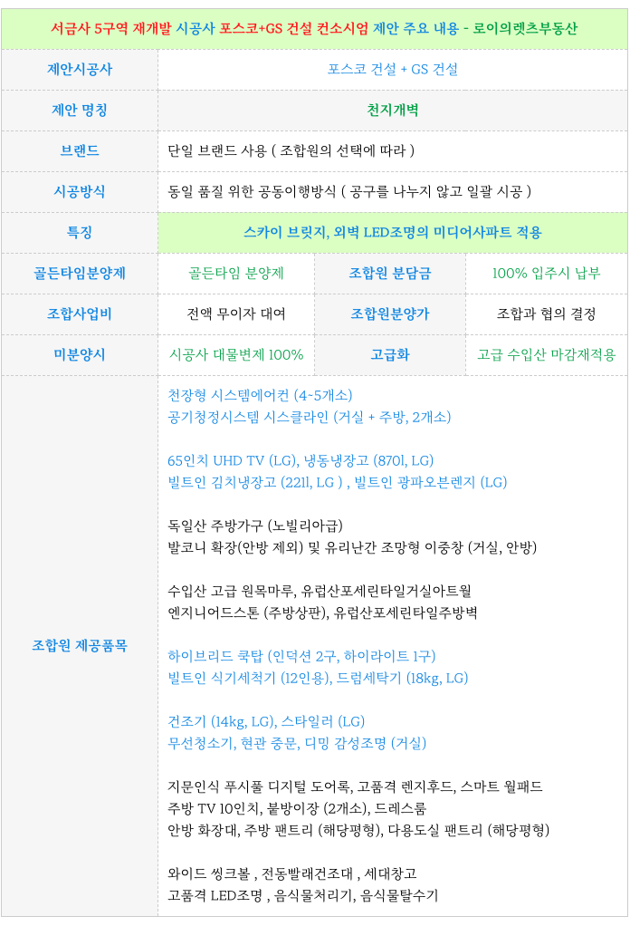 - 포스코, GS 건설 특화, 골든타임분양제, 조합원 분담금 입주시 100% 등