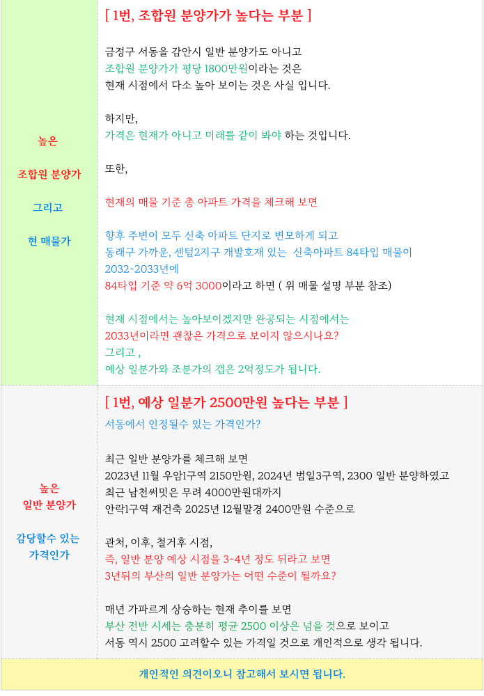 조합원 분양가와 일반 분양가는 현재의 서동 모습에서는 좀 받아들이기 힘든 가격이어서