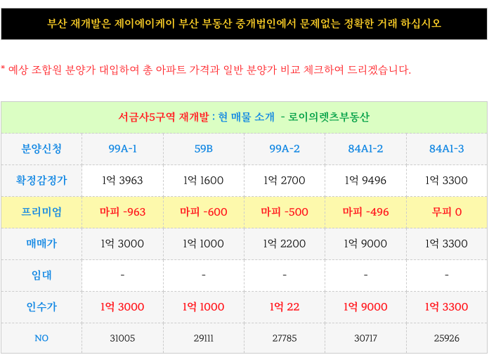 1. 서금사5구역 재개발 : 마피, 무피 현 매물 소개 :