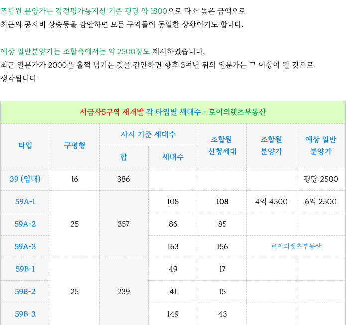 5. 서금사5구역 재개발 : 타입별 세대수 + 분양가 :