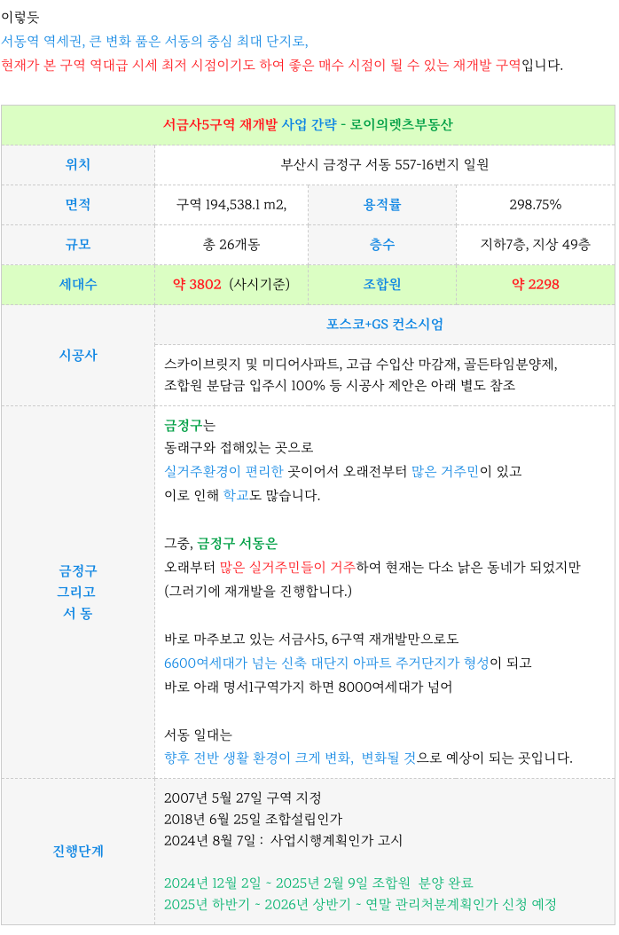 6. 서금사5구역 재개발 : 사업 주요 특징 재정리 :