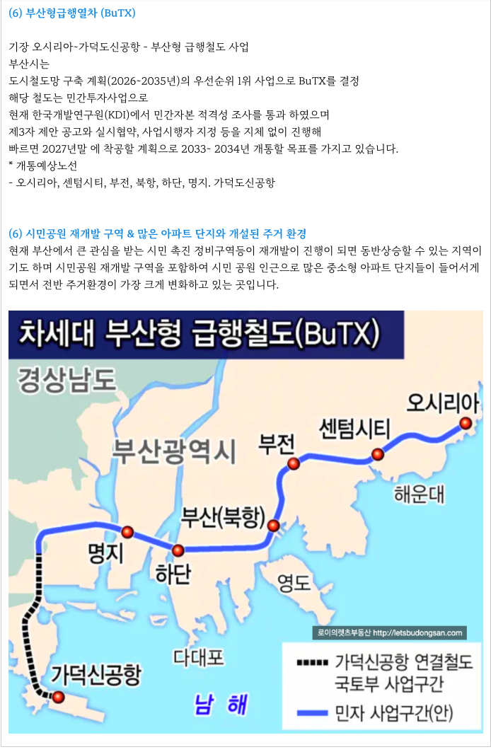 또한, 기장~사상 대심도, 부산형 급행열차 (BuTX) 등 여러 교통 개발호재 역시 품고 있어