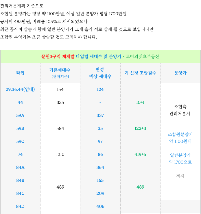 조합원 분양가는 현재 제시된 평당 1100 그리고 조금 상승고려하여 평당 1200으로 2개로 비교하였으며