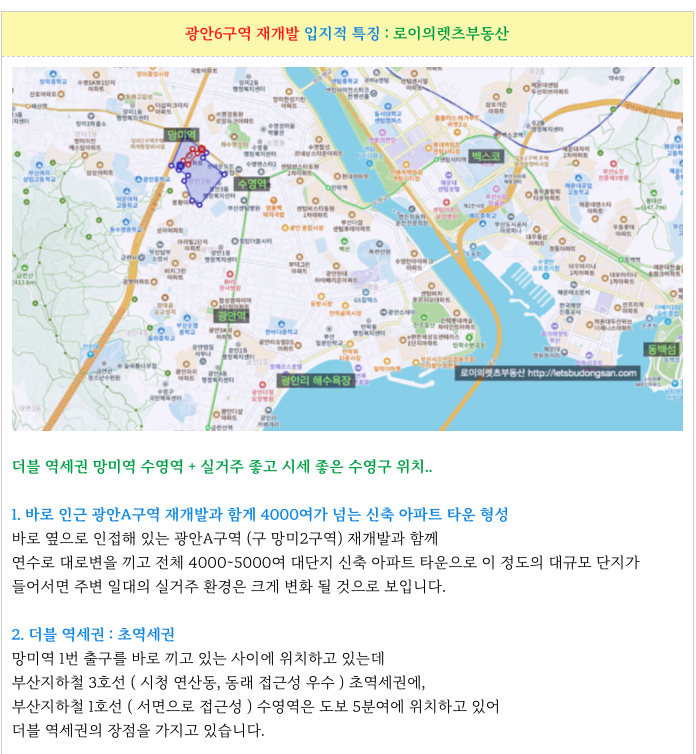 안녕하세요 로이의렛츠부동산 ( JAK 제이에이케이 부산 ) 입니다. 오늘은 더블 역세권 광안6구역 재개발...