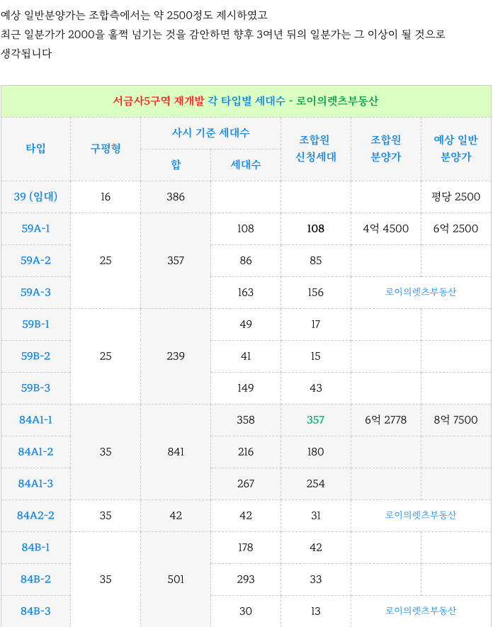 4. 서금사5구역 재개발 : 타입별 세대수 :
